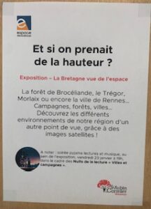 L’espace des sciences s’expose à la médiathèque 28Jan Les élèves de chaque classe, de la maternelle au CM1, ont pu profiter de l’exposition: « Si la Bretagne prenait de la hauteur ». Les élèves ont ainsi pu découvrir leur ville et leur région vues d’un satellite. Un moment très intéressant pour tous